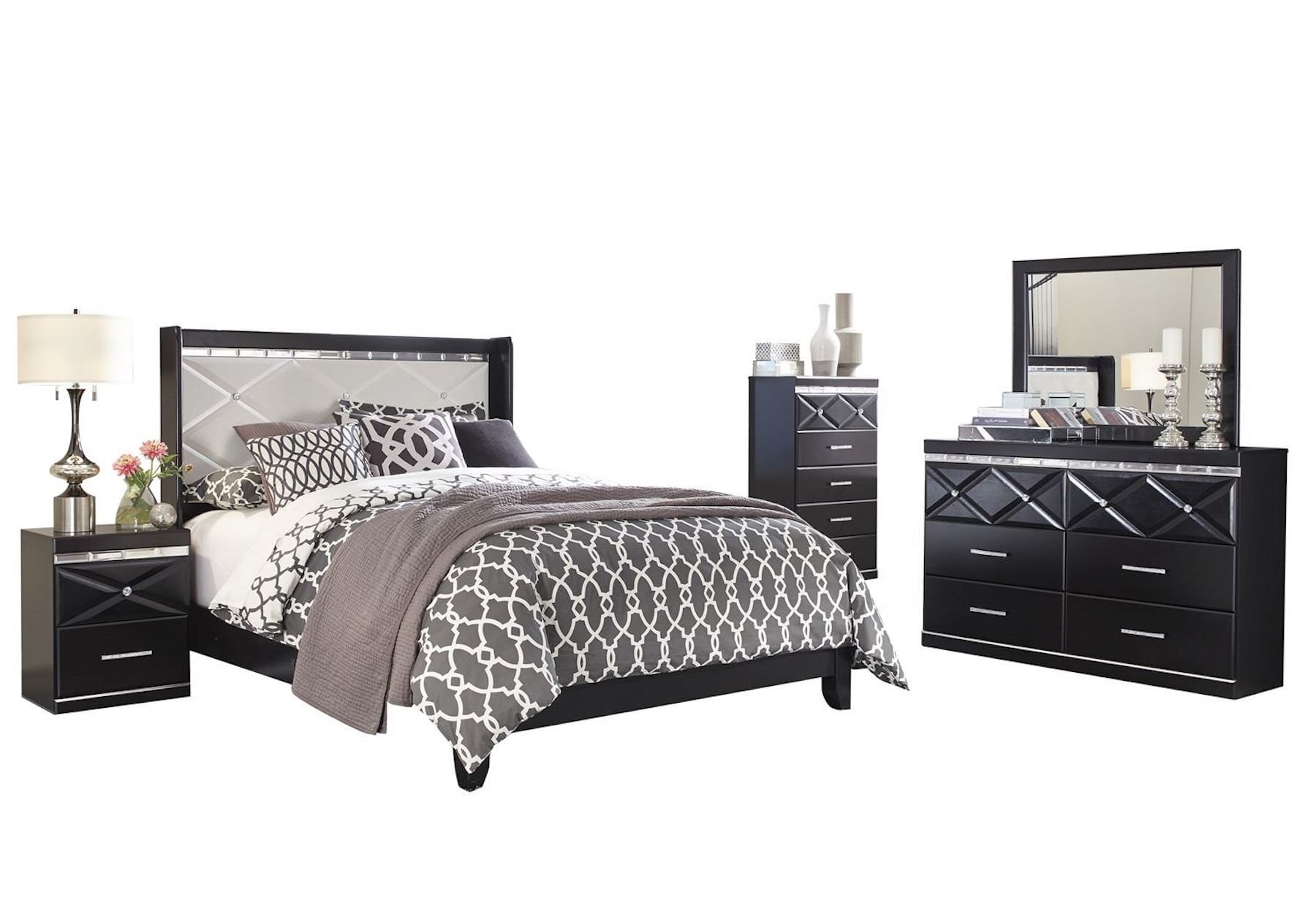 The nightstand does have a small area of black missing on the top at the back (see pic). This is a black and silver signature ashley furniture set. Azha black queen size bed cm7194bk (gwendolyn) furniture of america modern beds. Ashley ralene 6pc bedroom set queen upholstered storage bed dresser mirror two nightstand chest in dark brown.